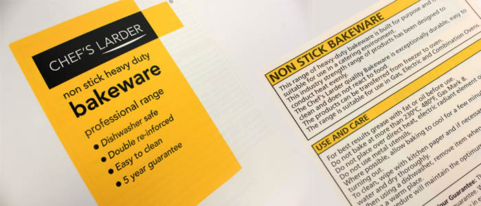 These bright and striking for labels for Chef’s Larder’s bakeware range are currently being printed on our state of the art printing presses. Produced using the latest UV inks for the most vivid colours these labels are sure to stand out even in the busiest of market places. These labels feature one of Etiquette’s special removable adhesives that allow the end user to remove the label to reveal instructions on how to best care for your product without having to compromise on design. Chef’s Larder is part of the Booker Group which is the UK’s leading food wholesaler. The Company is also the UK’s largest cash and carry operator, offering branded and private-label goods which are sold to over 486,000 customers including independent convenience stores, grocers, leisure outlets, pubs and restaurants. The Booker Group’s products are renowned for their quality products and attention to detail that is put into every product, just like us at Etiquette. Our decades of experience in the labelling industry mean we can provide the perfect solution tailored around your business. For more details contact Etiquette on 0845 222 0354 or you can email the Sales Team at: sales@etiquette.co.uk