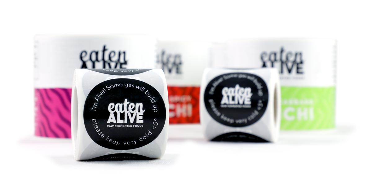 New one colour circular labels for Eaten Alive Raw Fermented Foods featuring the company logo and storage instructions are fresh off the Etiquette presses. The labels give the customer helpful information about the product whilst raising brand awareness with the inclusion of the company logo. We have printed labels for the entire range of products offered by Eaten Alive which can be found HERE. For more details you can contact Etiquette on 01978 664544 or you can email the Sales Team at: sales@etiquette.co.uk