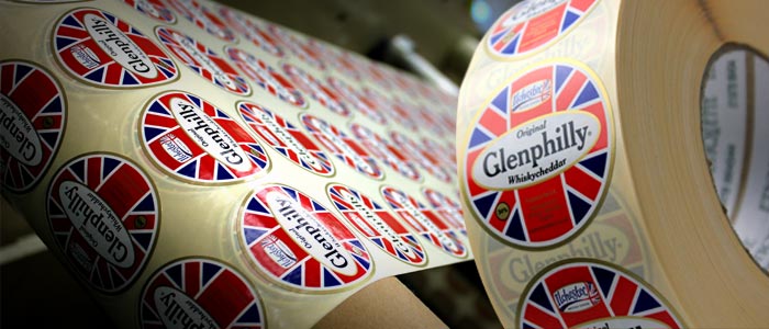Being printed on the presses today are these very patriotic Union Jack labels for Glenphilly Cheese. This particular cheese is produced in Somerset which is known as the British Mecca for the dairy and cheese industry.