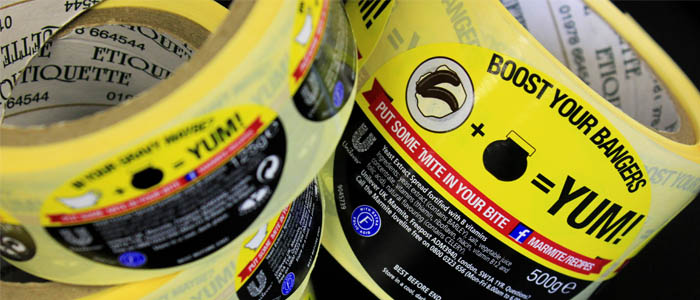 Currently being printed are these striking Marmite labels. Staying true to one of Britain’s most iconic colour schemes these labels were printed using the latest UV ink technology for maximum on shelf appeal complete with infographics that look good enough to eat themselves! These labels are part of Marmites Boost your Bangers (and gravy) campaign encouraging customers to put some Mite in their Bite by trying Marmite with different foods and uploading their own recipes to the marmites Facebook page.