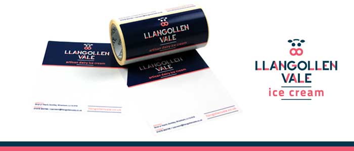 Fresh off the presses are these modern labels for Llangollen Vale Ice Cream located in North Wales. Llangollen Vale Ice Cream is made with the milk from my family dairy farm which lies in the rich green pastures of the Welsh Borders near Wrexham. All the produce comes from their award winning herd of Holsteins which graze on the lush grass provided by the unique Welsh climate.