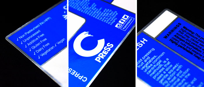 CPRESS have one simple mission which is to create wholesome products that promote wellness in their customers through honest, clean, organic foods. Offering a wide range of juices, salads and desserts onto the market CPRESS enlisted the help of the UK experts in labels and labelling to maximise their on shelf-appeal. From the initial design and consultation stage through to print and production we used our specialist knowledge to make sure that the labels perform better than any other on the market. Featuring a new logo and embellished with silver foil, these labels were printed using the latest in UV ink technology and finished with an over printable varnish that allows CPRESS to customise the labels by printing variable information onto them on demand, making these labels very versatile. For more details contact Etiquette on 0845 222 0354 or you can email the Sales Team at: sales@etiquette.co.uk
