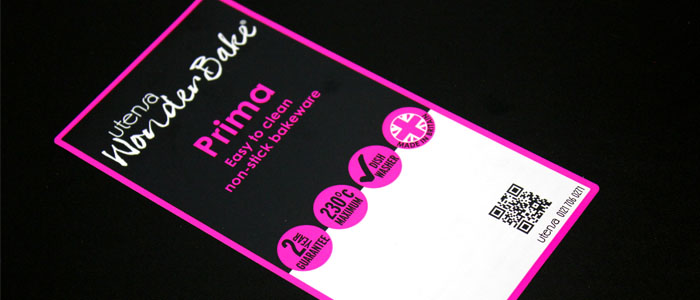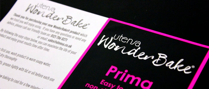 Being printed on the presses today are these vibrant labels for Utensa’s Wonder Bake range. These new labels are the latest in a range that has been produced by us here at Etiquette. Utensa are well renowned for producing bakeware of the highest quality. All Utensa products utilize coil coated material where the non-stick paint is applied by a special roller system that ensures a uniform thickness of coating, helping the products last longer and perform better. The bold three colour design is sure to catch the eye of any potential customer. These labels were finished with an over printable varnish that allows Utensa to print variable information over the labels. A unique feature on this label is the QR Code, which links straight the Utensa website. On the reverse side of the label is instructions on how to care for the products and use it correctly, showing that Utensa care just as much about your baking as yourself. For more details contact Etiquette on 0845 222 0354 or you can email the Sales Team at: sales@etiquette.co.uk